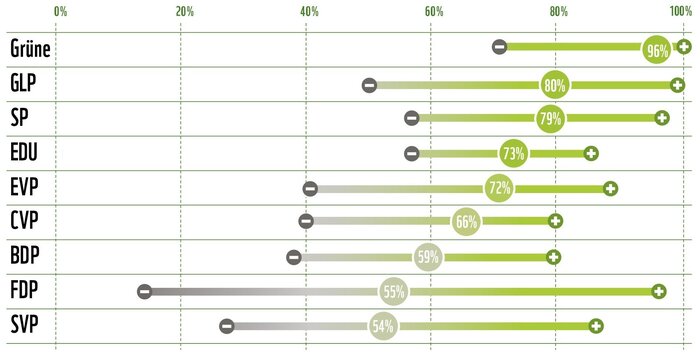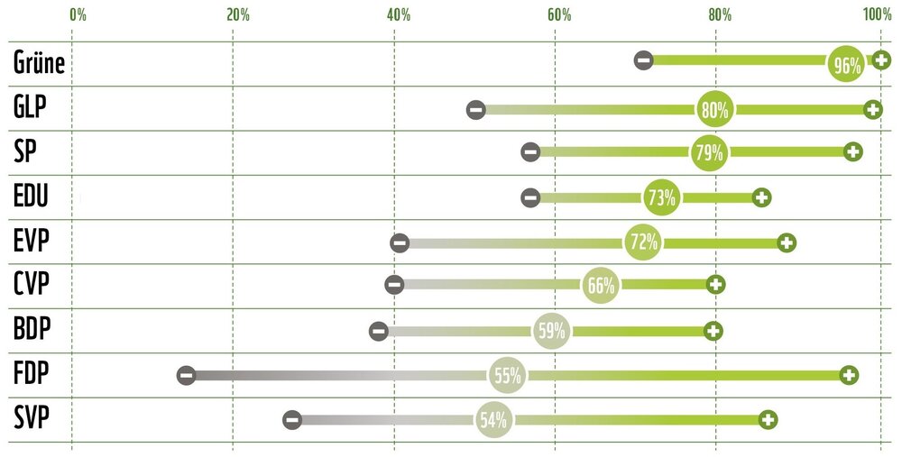Dies ermöglicht den Wählerinnen und Wählern, sich ein detaillierteres Bild des Kandidatenfeldes zu machen. Am umweltfreundlichsten sind im Durchschnitt die Kandidierenden der Grünen, gefolgt von den Grünliberalen und der SP. Aber auch aus den anderen Parteien gibt es einzelne Kandidierende, die sich im Rating als sehr umweltfreundlich erweisen.