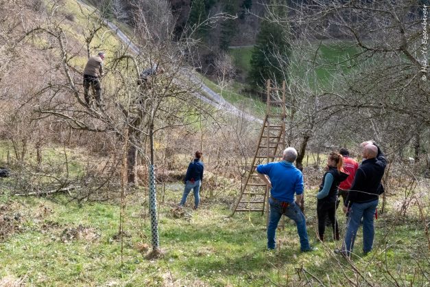 Ein Selbstläufer ist deren Pflege nicht, aber es braucht auch nicht die ganz grosse Professionalität, um mit einem Obstbaum langfristig glücklich zu werden. Der Naturgärtner Markus Allemann führte mit einigem Schalk und viel Fachkenntnis durch den Tag. Ganz leicht hatte er es nicht. Die Vorkenntnisse des Teilnehmerfeldes waren breit gestreut, und so wechselte Allemann vom Basiswissen zum Profitipp hin und her. Nach und nach tat sich eine bunte Welt auf, in der es sich, vorausgesetzt, man beachtet einige Grundregeln, sehr gut bewegen lässt und die nicht in Stein gemeisselt, sondern ganz im Gegenteil eine ganze Palette von Möglichkeiten bietet, einem Obstbaum zu begegnen. Denn darum gehe es im Kern, sagt Allemann. Man müsse sich dem Baum nähern, ihn kennenlernen, von allen Seiten betrachten, um herauszufinden, was gut für ihn und den Menschen, der sich an seinen Früchten gütlich tun will, ist. Da lässt es sich dann vortrefflich sinnieren darüber, ob überhaupt und wenn ja, wie genau ein Zweig oder Ast, im Jargon Trieb genannt, zu schneiden ist, mit dem Ziel, dem Baum bis tief in die Krone hinein Licht zu schenken und ihn anzuregen, so zu wachsen, dass er langlebig und viele Früchte tragend zugleich ist. Das freut auch Fauna und Flora. Denn es sind nicht die weit verbreiteten, niederstämmigen Jungspunde, die der wilden Welt Freude bereiten, sondern die alten, knorrigen, mit Moos bewachsenen, Höhlen bildenden Hochstämme, die, wer Platz hat, auch stehen lässt, wenn sie das Zeitliche gesegnet haben. Dazwischen gilt es, die Früchte der Arbeit buchstäblich zu geniessen. Der WWF-Kurs bot besten Anschauungsunterricht.