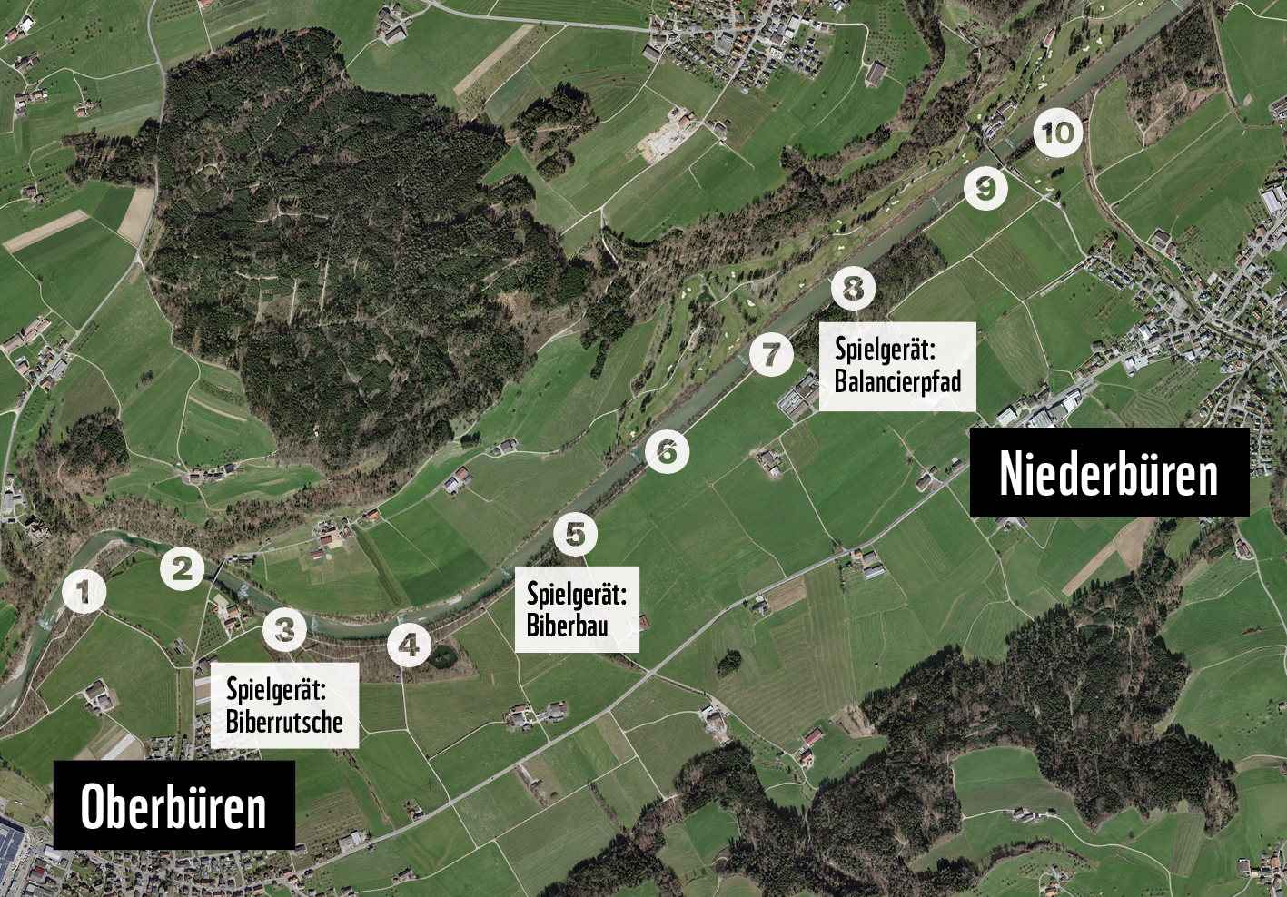 Anreise: Postauto-Haltestelle Oberbüren, Post oder Niederbüren, Dorf (Distanz bis zum Biberpfad je etwa 1 km)
