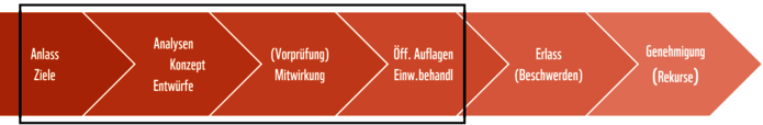 Im Idealfall befindet sich die Gemeinde in einer Phase des Prozesses, wobei über die Integration in das Baureglement der Themen Biodiversität, Klimaanpassung und Freiraumqualitäten diskutiert werden kann. Je früher die Gemeinde im Prozess steht, desto besser lassen sich die Themen verankern.