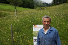 Eigentlich meldete Jungbauer Daniel Gmür die auf 760 Meter über Meer gelegene Bergwiese zur Meisterschaft an. Doch weil er – wie so viele Bauern – nicht mehr vom Ertrag des Hofes leben kann, arbeitet er zusätzlich in einer Schreinerei. Nun steht sein Vater Jakob vor der Informationstafel zur Wiesenmeisterschaft. Hinter ihm blüht es in allen Farben. In der Bergwiese fanden die Botaniker 20 für den Wettbewerb massgebende Pflanzenarten. Die Wiese ist abschüssig, nach Süden ausgerichtet und strukturiert. Der Sonneneinfallswinkel verändert sich je nach Steilheit. Gleichzeitig verändert sich auch die Bodenfeuchtigkeit. Auf Daniel Gmürs 30 Aren grosser Bergwiese blühen unübersehbar die lila Bergflockenblumen. Es gibt Horn- und Hopfenklee, Herbstzeitlosen, Gelbe Primeln, Betonien, mehrköpfige Korbblütler, Margriten, Wiesensalbei, Witwenblumen, Silberdisteln, Mauerpfeffer aber auch verschiedene Grasarten wie die aufrechte Trespe oder das Raugras. Jakob Gmür hilft seinem Sohn auf dem Hof. Er verzichtet auf den Einsatz einer Motorsense und mäht die Blumenwiese im Spätsommer noch mit weit ausholenden, ziehenden Bewegungen mit der Sense. Er klagt: „Vielen Jungen fehlt die Zeit. Sie haben keine Geduld, oder sie haben es nicht richtig gelernt. Mir fällt es leicht, mit der Hand zu mähen.“ Im Stall seines Sohnes Daniel Gmür stehen 16 Mutterkühe mit Kälbern. Im Sommer weiden sie auf der Alp. Die Mutterkuhhaltung ist weniger arbeitsintensiv, was dem berufstätigen jungen Mann entgegenkommt.