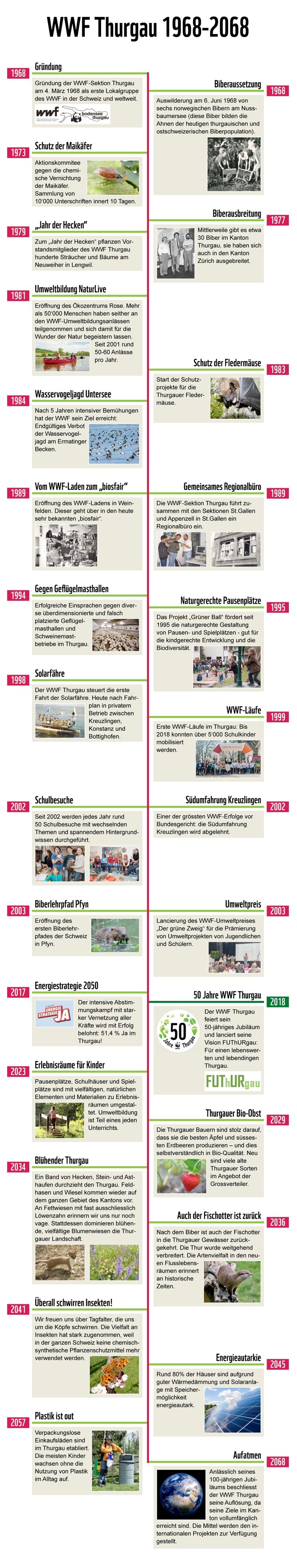 Es ist bekannt, dass der WWF Thurgau im Jahr 1968 dafür gesorgt hat, dass die Biber in die Ostschweiz zurückkehrten. Was jedoch weit weniger Beachtung findet und heute kaum mehr vorstellbar ist: erst 1984 wurde die Wasservogeljagd im Ermatinger Becken am Untersee verboten. Dafür hat sich der WWF während 5 Jahren intensiv engagiert. Fast gleichzeitig hat er damit begonnen, sich für den Schutz der Fledermäuse einzusetzen. So entstand die „Thurgauische Koordinationsstelle für Fledermausschutz“, welche über 30 Jahre durch das langjährige WWF-Vorstandsmitglied Wolf-Dieter Burkhard und seine Frau Ursula geführt wurde.